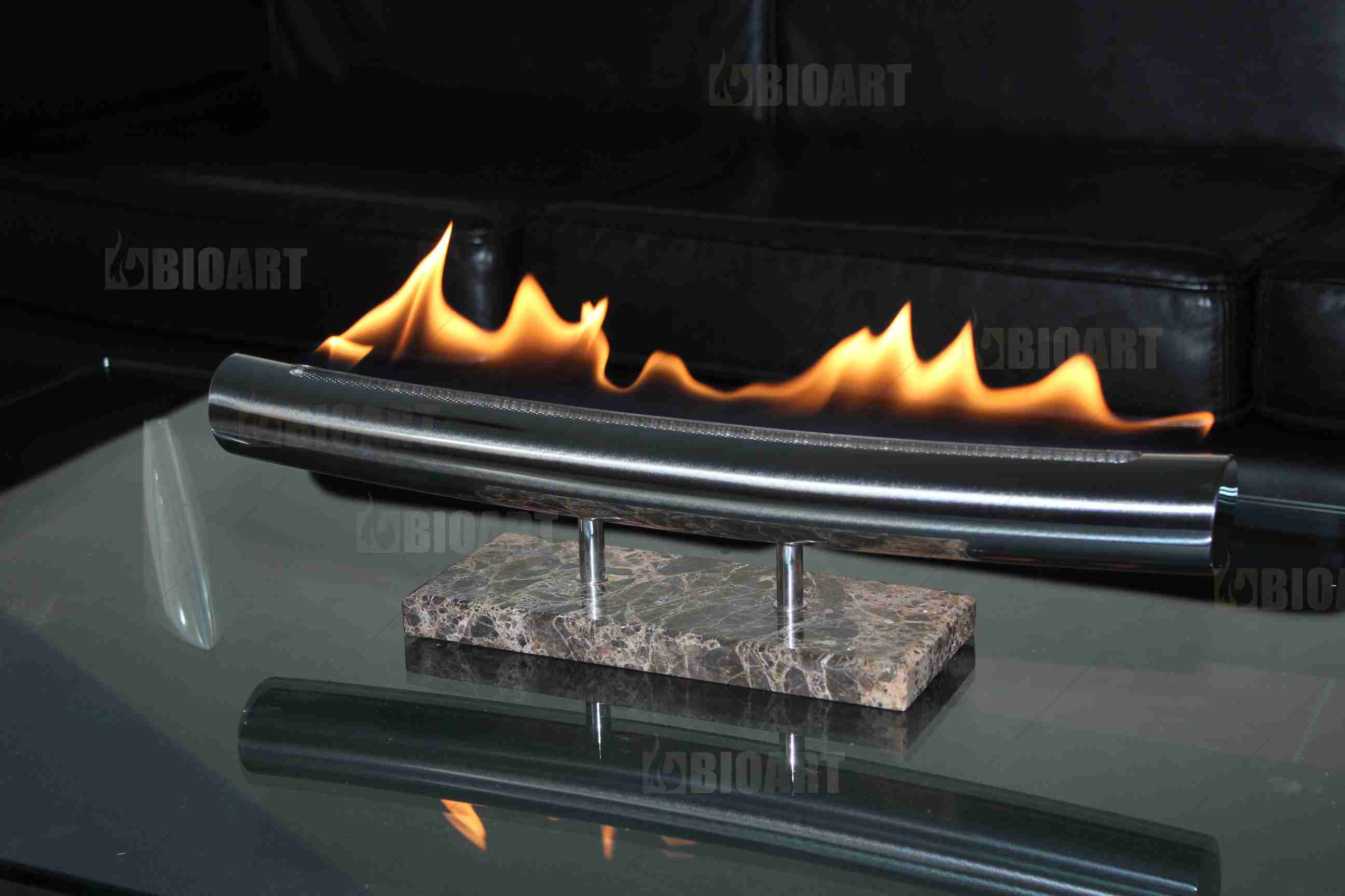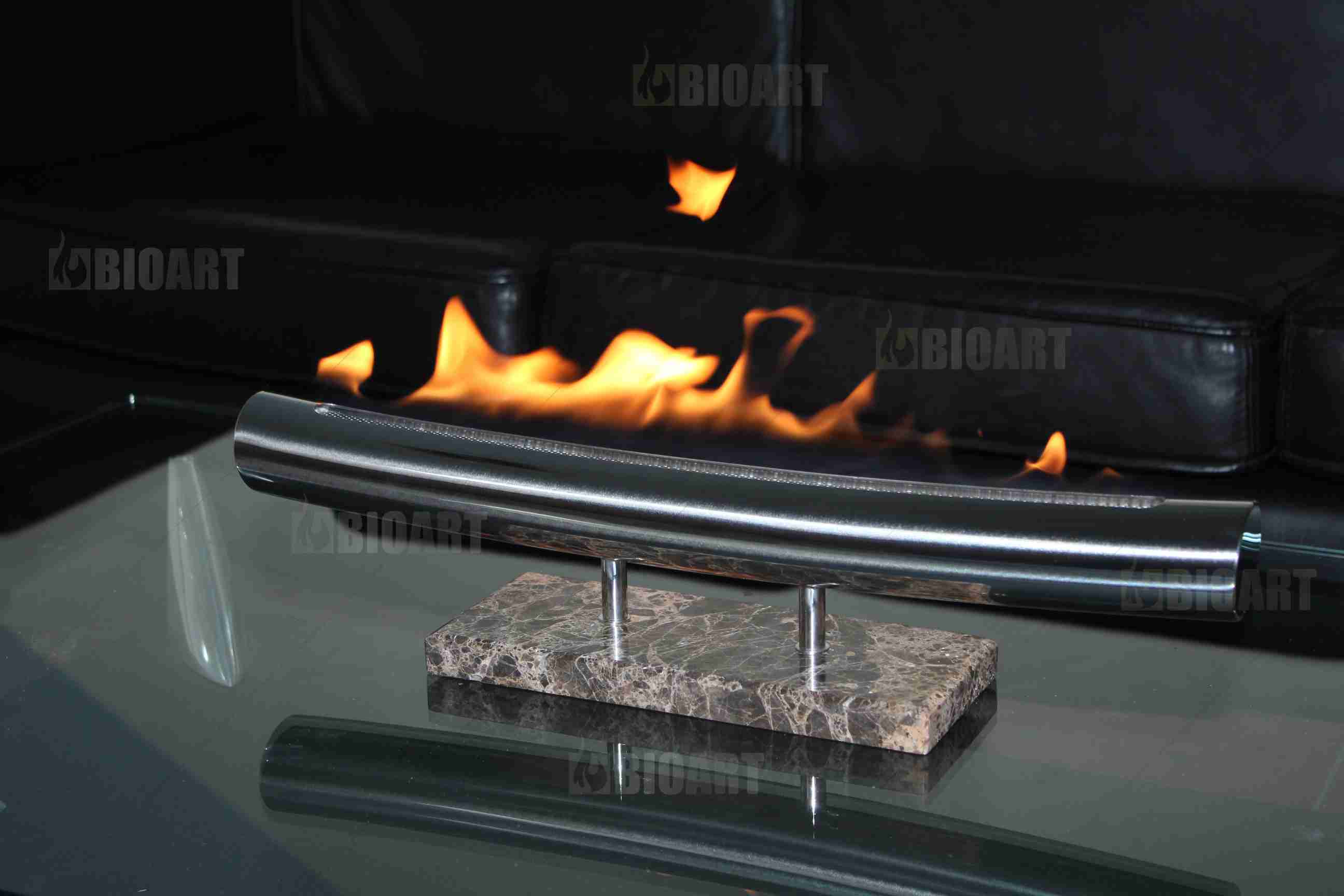 Стандартно биокамин выпускается с мраморной подставкой, цвет которой вы можете подобрать индивидуально. У вас также есть возможность декорировать её под стиль интерьера, сделать надпись, например, пожелание ко Дню рождения.