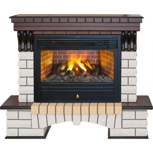 Портал каминокомплекта выполнен в стиле кантри. Визуально он напоминает классические дровяные камины. Обрамляют очаг стенки, выполненные из камня, верхняя часть которых спереди оформлена резными изогнутыми консолями. Используются они для визуальной поддержки выступающей вперед массивной каминной крышки. Ее кромка оформлена геометрической резьбой. Верхняя панель над очагом отмечена лишь вставкой из МДФ, на которую также нанесен геометрический узор. Основание портала выполнено в форме арки, свод которой оформлен каменным клином. В полученный арочный проем можно уложить декоративные поленья, что позволит закончить общий вид. По бокам на основание уложены полочки из МДФ, на которые при желании можно поставить различный декор. Непосредственно зона очага оформлена имитацией клинкерного кирпича.