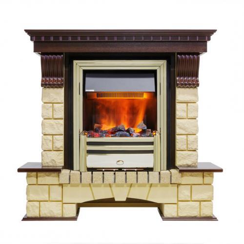 Каминокомплект «Pierre Luxe», выполненный в цвете «Шампань» и оборудованный современным очагом «Opti-Myst Cavendish», хоть и смотрится просто из-за своей классической формы, но зато дизайн портала продуман до мелочей. В этом камине отлично сочетаются традиционные натуральные и искусственные материалы. Основа портала выполнена из прочного МДФ. Естественно, по прочности камню он уступает значительно, но зато вес его намного ниже. Благодаря этому при установке каминокомплекта нет необходимости в формировании мощного фундамента. Сверху МДФ покрыт материалом, отлично имитирующим натуральный камень. Декоративные элементы портала выполнены также из МДФ. Сверху он покрыт натуральным шпоном, имитирующим расцветку и фактуру темного дуба.